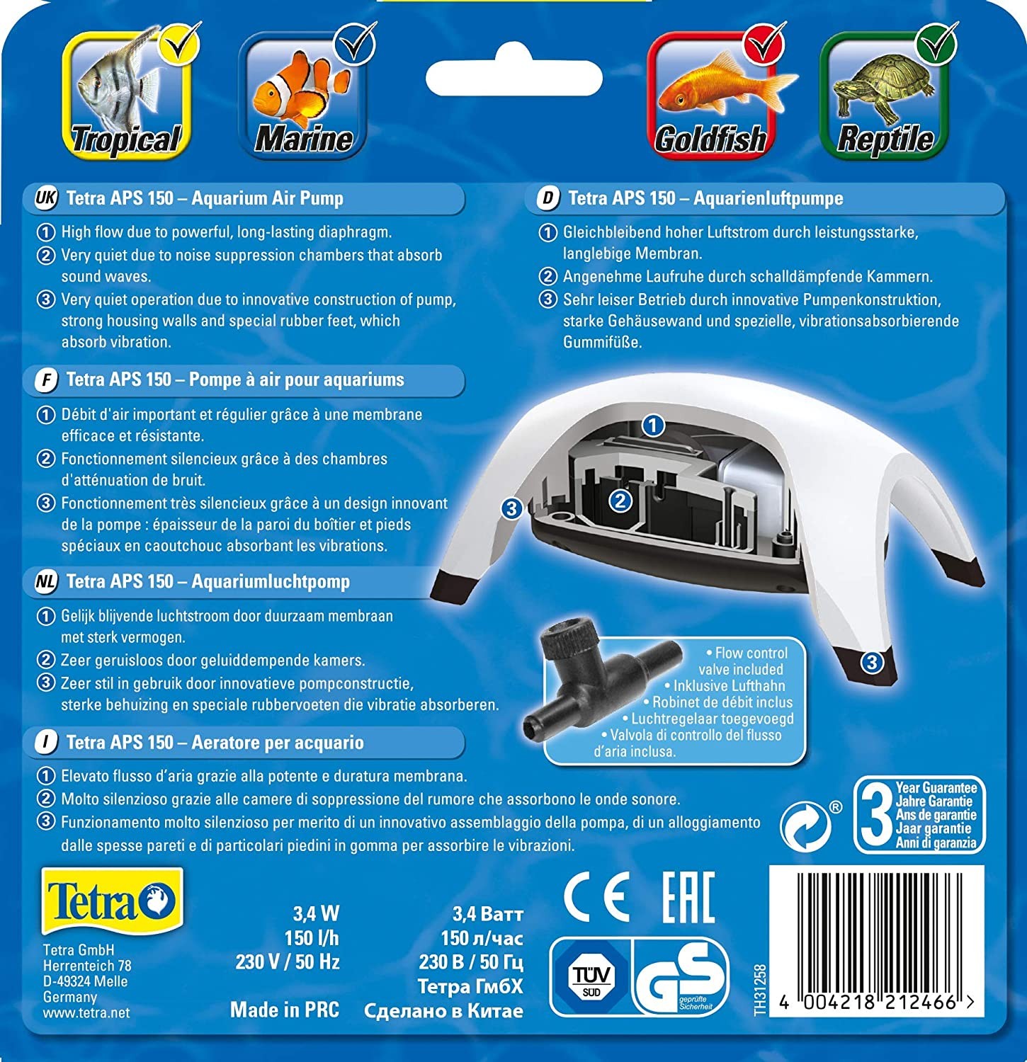 Notre pompe à air Tetra APS 50 au design innovant est extrêmement puissante. Avec son débit réglable de 50 l/h, elle vous assure un débit d’air fort et régulier. Notre APS 50 est parfaitement adaptée pour oxygéner l'eau d'un aquarium de 10 à 60 litres. Son réglage et son utilisation sont très faciles grâce à son robinet de réglage